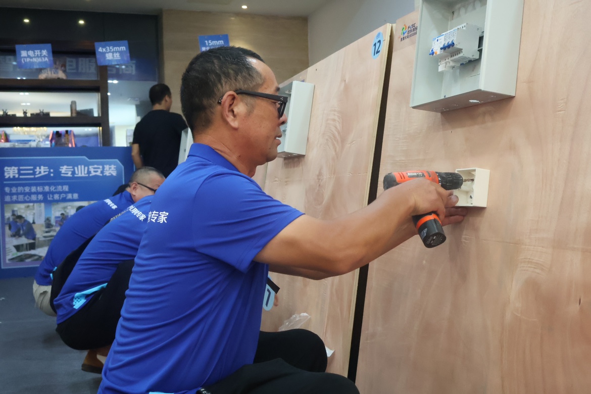 參賽選手需要在規(guī)定的時間內(nèi)根據(jù)圖紙完成布線,滿足用電安全與美觀等要求,在實際工作中,專業(yè)的安裝技巧能讓自己更自信,讓業(yè)主更安心
